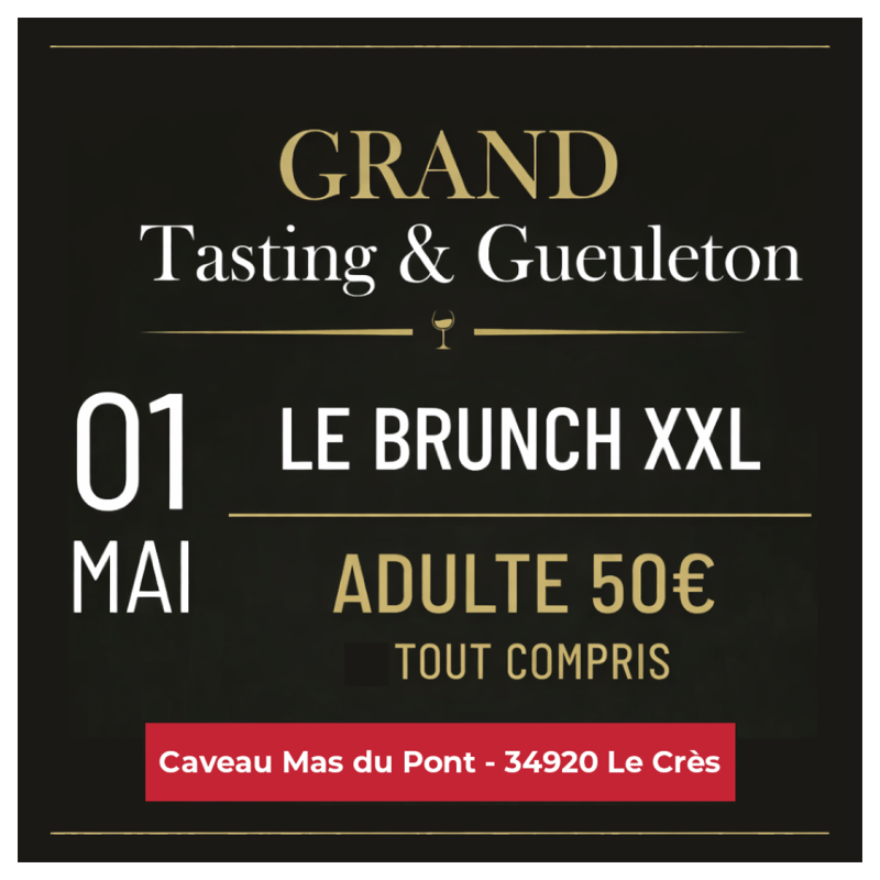 Rendez-vous à la cave du MAS du Pont au Crès le vendredi 1er mai 2026. Le Brunch XXL avec plus de 100 cuvées d'exception à déguster !